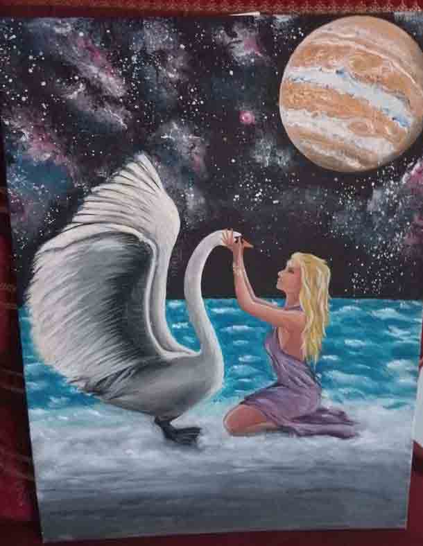 Леда — царица спарты, жена царя Тиндарея была оморочена и соблазнена Зевсом, который предстал перед ней в образе лебедя. В результате порочной связи Леда произвела на свет 2 яйца. По одной из версий из которых появились Елена Троянская и близнецы Кастор и Поллукс. Картина выполнена в технике живописи акрилом. Энергия этой картины работает как талисман для: